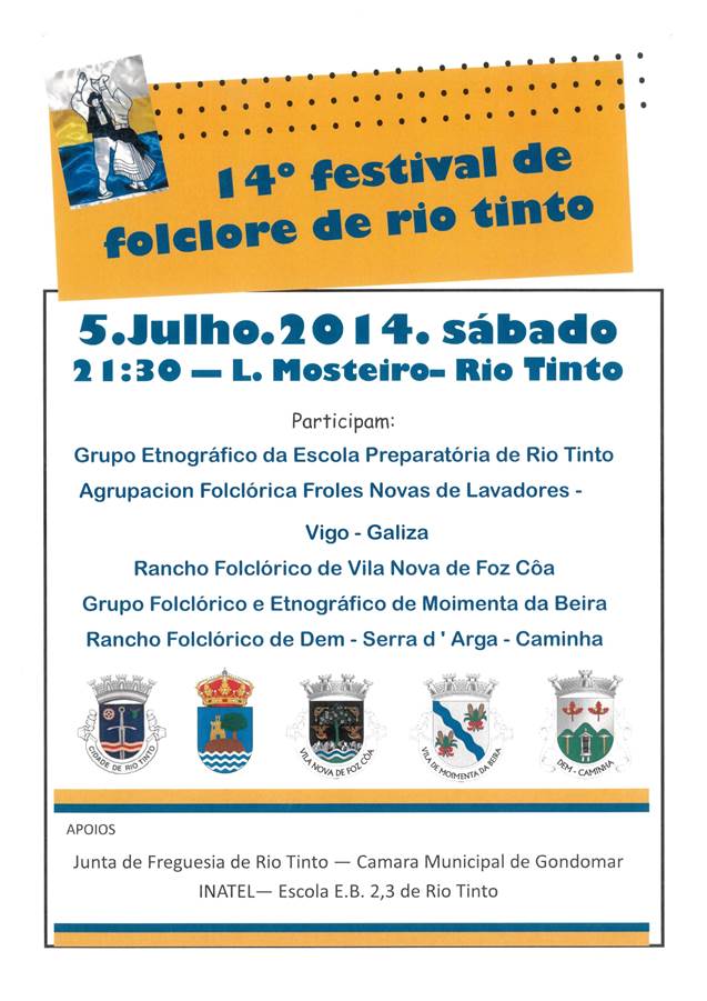 Convido toda a população a assistir ao 14º Festival de Folclore de Rio Tinto, organizado pelo Grupo Etnográfico da Escola Preparatória de Rio Tinto com o apoio da Junta de Freguesia.