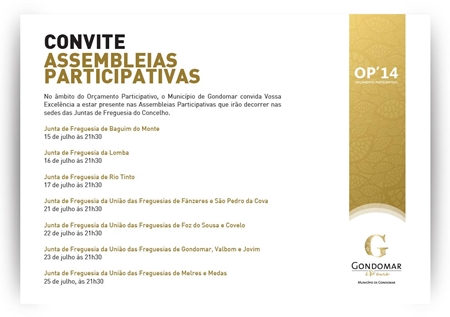 Já está elaborado o calendário das Assembleias Participativas que irão decorrer, nas sedes das Juntas de Freguesia do Concelho, no âmbito do primeiro Orçamento Participativo de Gondomar.